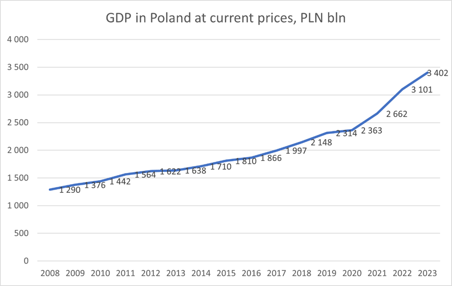 Hearing or reading the news reported by the mass media that the economy has “grown” by some percentage, many people probably wonder to whom and what has actually grown. Such an announcement is, of course, about the GROWTH of the most important macroeconomic aggregate, i.e. GROSS DOMESTIC PRODUCT – GDP. To illustrate, in Poland from 2008 to 2023 GDP growth was 264%. The values of this aggregate in each year of this period are shown in the chart below.
